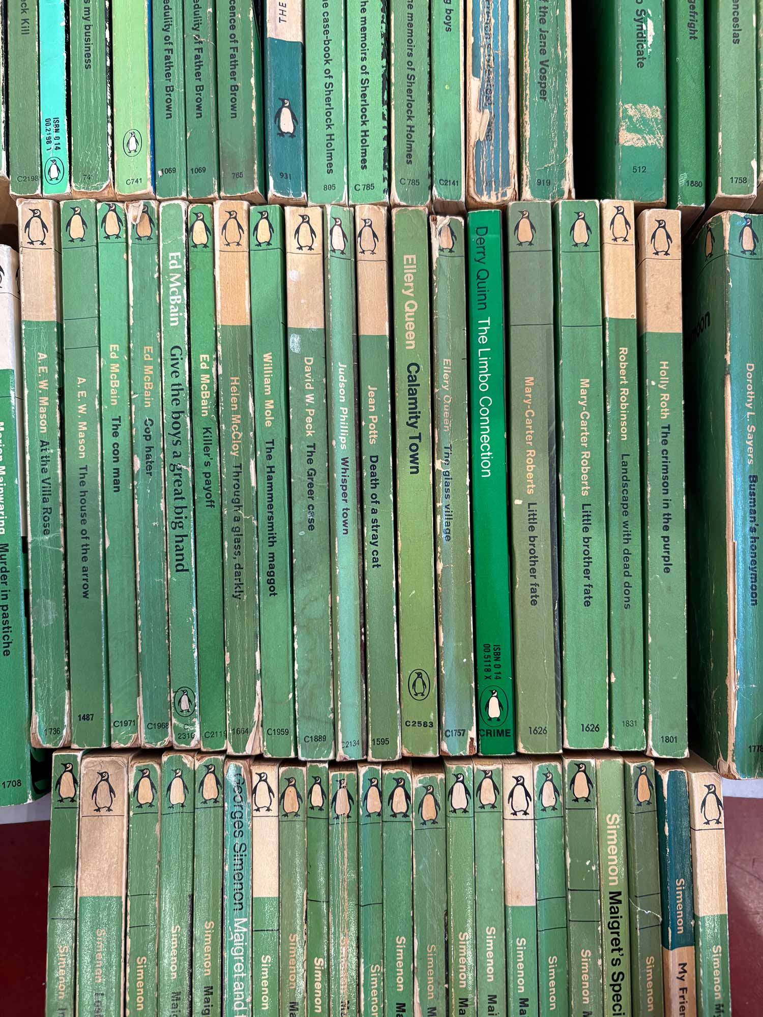 After years and years of doggedly collecting what are commonly called “Green Penguins,” a series of hundreds of crime novels published with green covers by the UK publisher Penguin in the 1960s, I’ve both mounted an exhibition of the collection, and created a zine that documents the history of the books, their design, and the designers that made them. The content in the zine is an expansion and re-crafting of the writing I did about these books here, on the Justseeds blog, for my old Judging Books By Their Covers series (you can read those HERE).